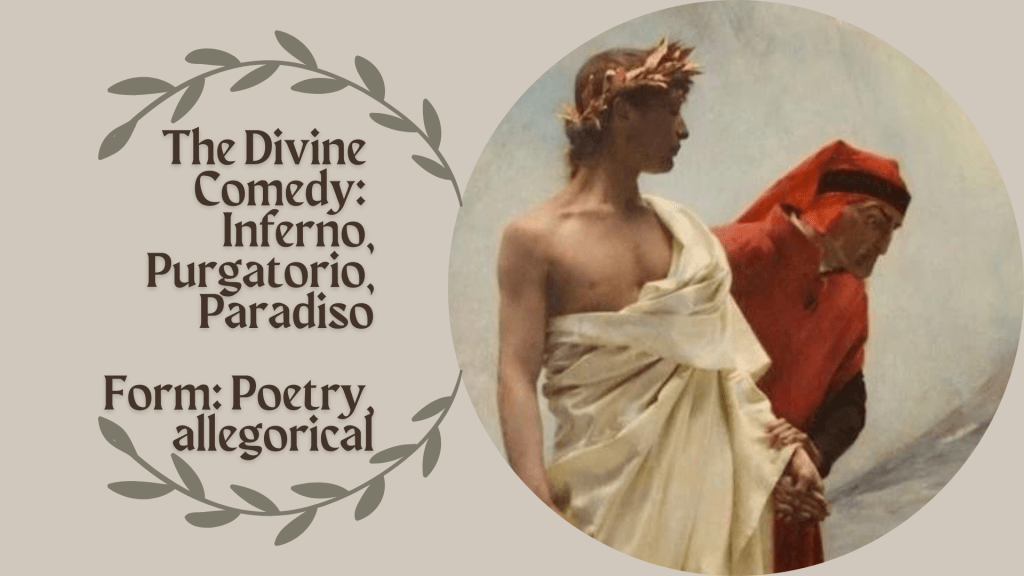 I also recommend a few different resources for this massive work. There’s the Great Courses series of lectures, Dante’s Divine Comedy, by Ronald B. Herzman and William R. Cook. Likewise, 100 Days of Dante has a video on each canto. The website and the videos are immensely helpful, and I can only sing their praises. The website has even more extensive resources, but my main recommendation: read this work over, and over, and over.